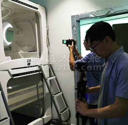 上个星期,香港卫视特派了两名记者来到鹏恒集团的总部,对鹏恒太空舱的工厂、设备、旗舰店进行了特别的专访,鹏恒的外贸部总监Cavin接待了两名香港记者,并且带领两位记者对鹏恒太空舱产品、酒店的性能和质量各方面都做了详细的介绍。